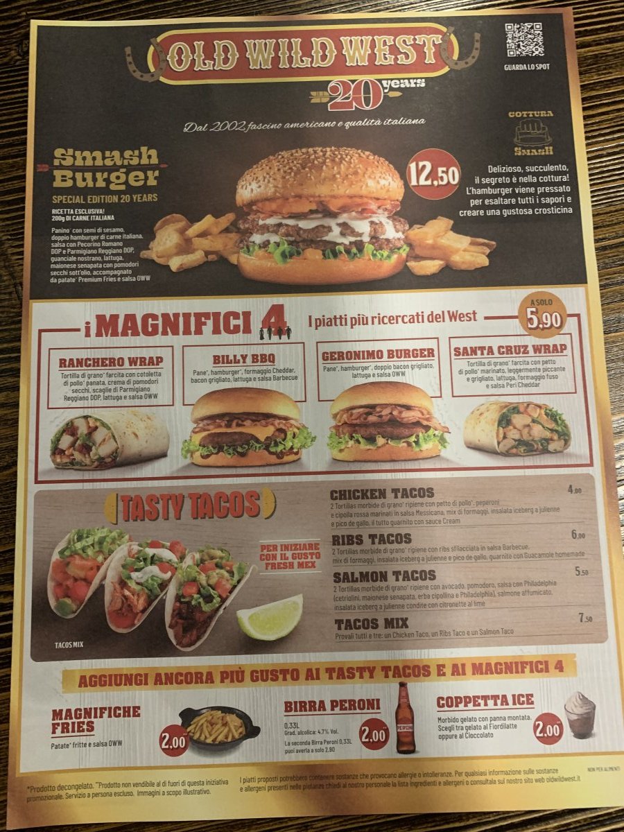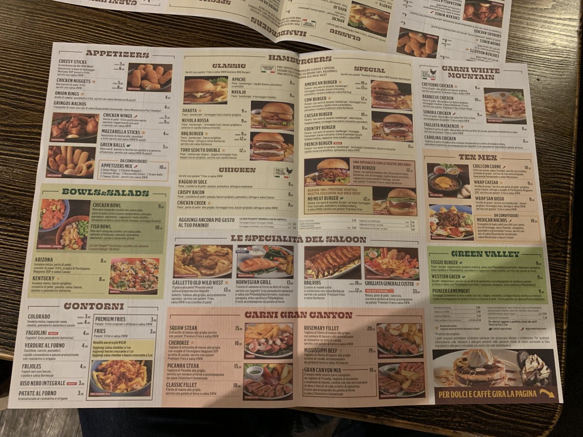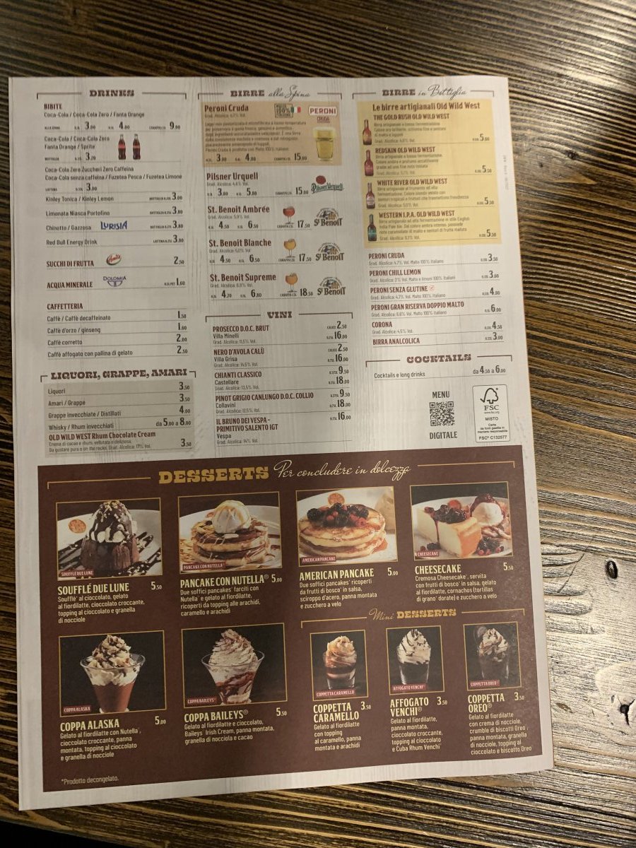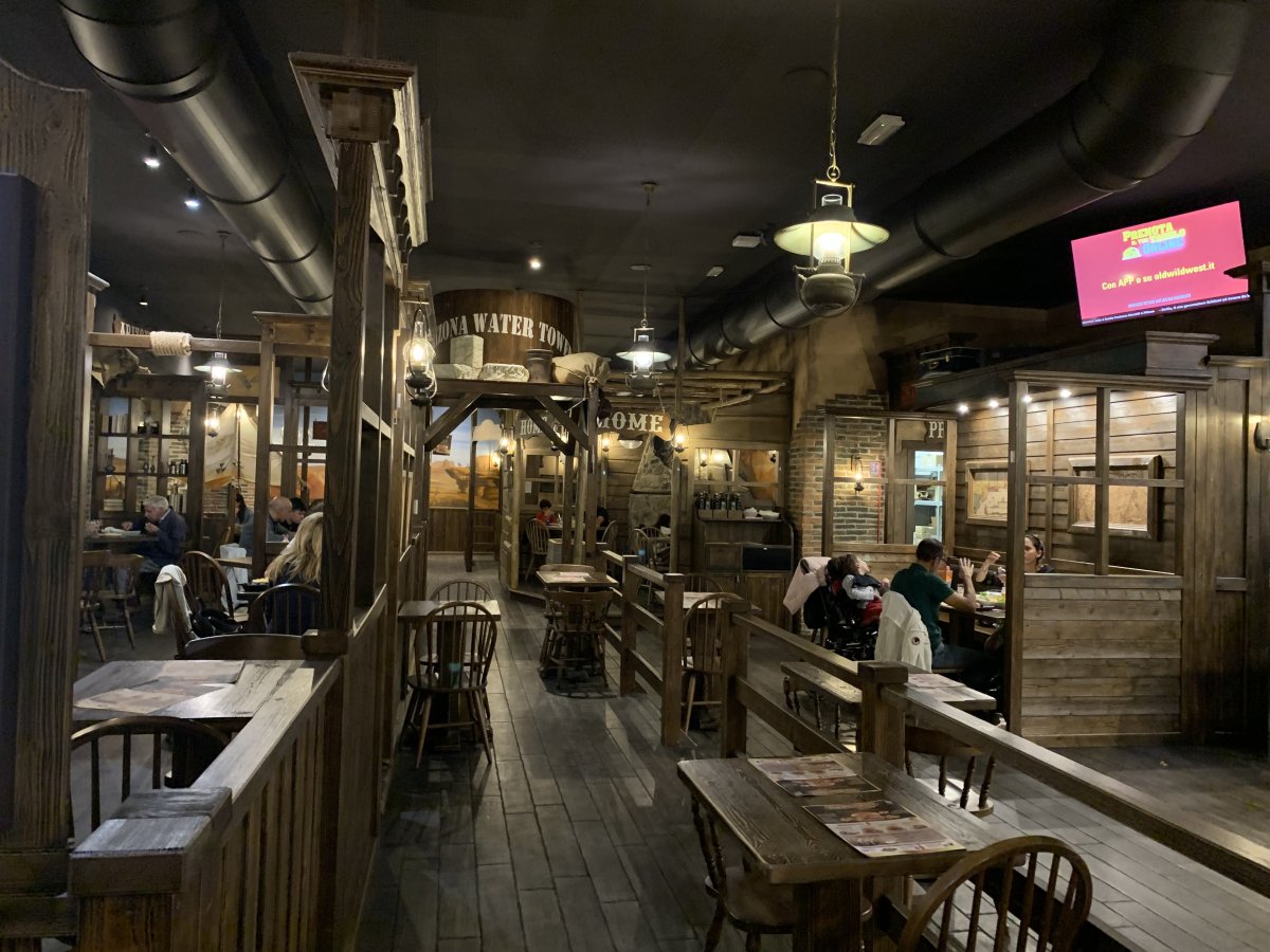 Sono andato con gli amici a cena all'Old Wild West. Un posto piuttosto suggestivo nello stile del selvaggio west. Il menu è vario, ma non ... More Sono andato con gli amici a cena all'Old Wild West. Un posto piuttosto suggestivo nello stile del selvaggio west. Il menu è vario, ma non tutto era disponibile. Ma i piatti sono molto unti e il servizio non è ai massimi livelli, purtroppo. Prezzi molto ragionevoli per l'alcol.